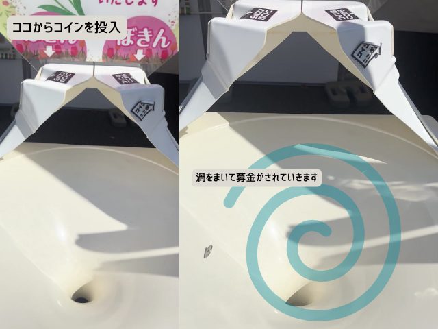 ちょっと変わり種の募金箱。募金のコインを入れるとくるくると渦をまいて募金箱に収められます。