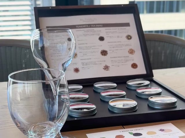 紅茶やお茶は、香りのサンプルとして茶葉がテーブルにセットされており、その香りを確かめながら好みの一杯を選べるのも嬉しいポイントです。