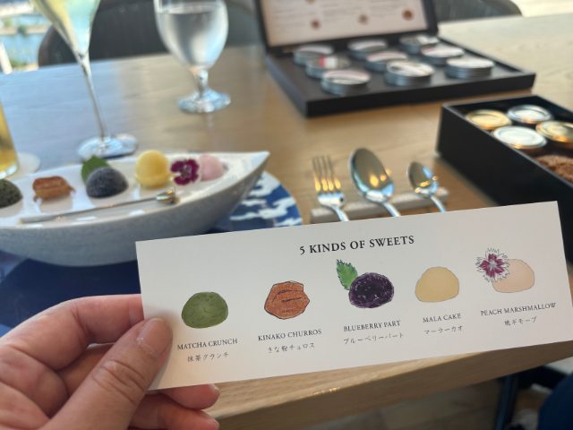 5種のスイーツは、抹茶クランチ、きな粉チュロス、ブルーベリーパート、マーラカオ、桃のギモーブ。