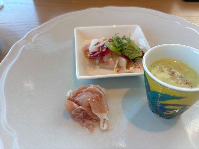 - アミューズ:フランス料理の流儀で、前菜の前に登場する“お楽しみ”のひと皿。
