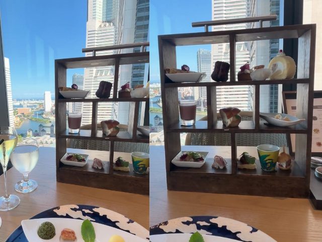 横浜らしさを感じさせる、中華のシノワズリ調飾り棚に乗って登場するセイボリー&スイーツ。