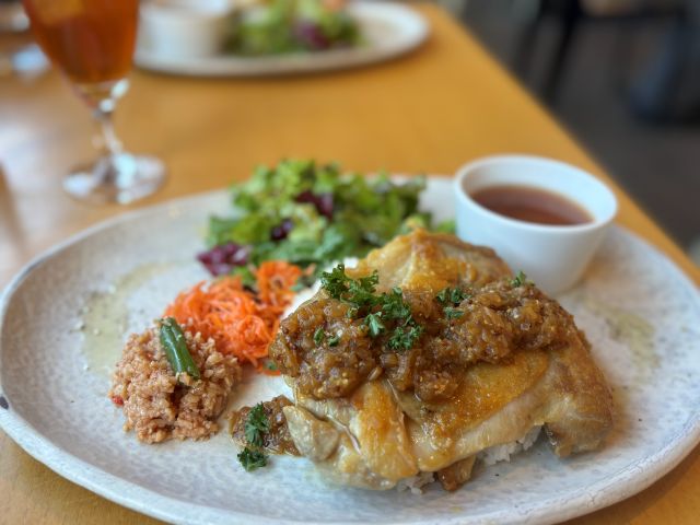 今回はローストチキンのプレートと飲み物、デザートがついたコースセットをお願いしました。チキンは少しエスニックな味付けで、お野菜もたっぷりといただけました。