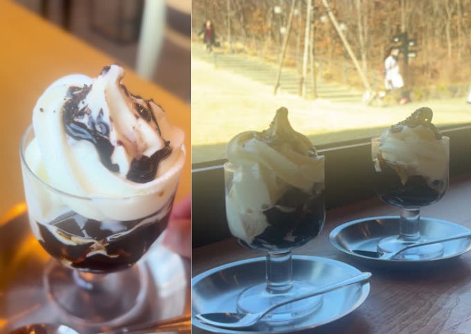ソフトクリームが上にのった珈琲ゼリー。2層を混ぜながらいただくのが最高でした。