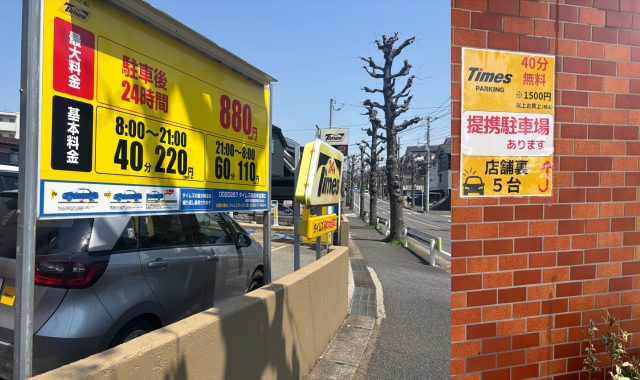 すももベーカリーの店舗裏にあるタイムズ「柿の台第2」が提携駐車場。1500円以上のお買い上げで40分無料になります。駐車券を提出しましょう。