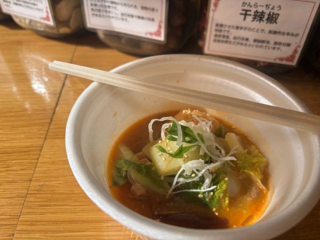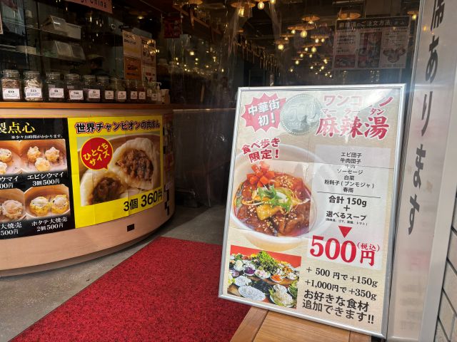 四川料理 楽山では、麻辣湯(マーラータン)は、食べ歩き用のワンコイン(500円)メニューが用意されているのが魅力。白菜や春雨、海老団子、ソーセージなど具だくさんで、価格以上の満足感があります。